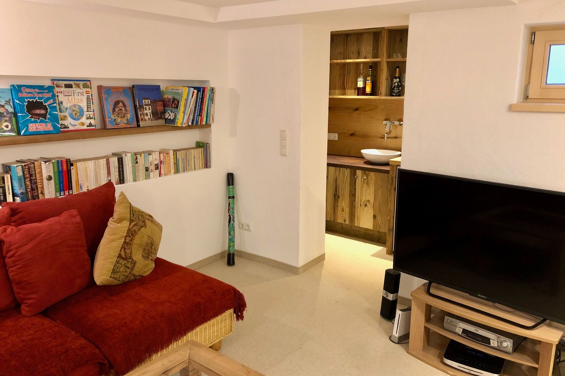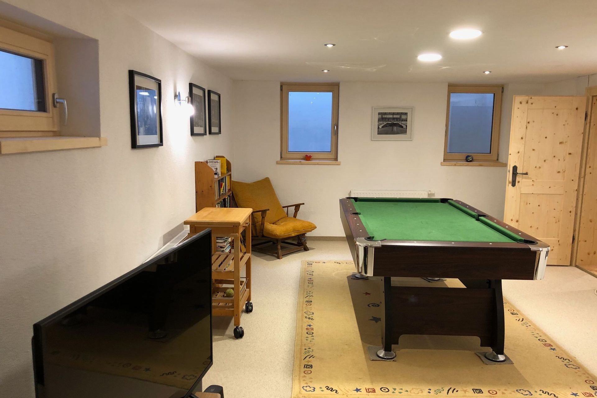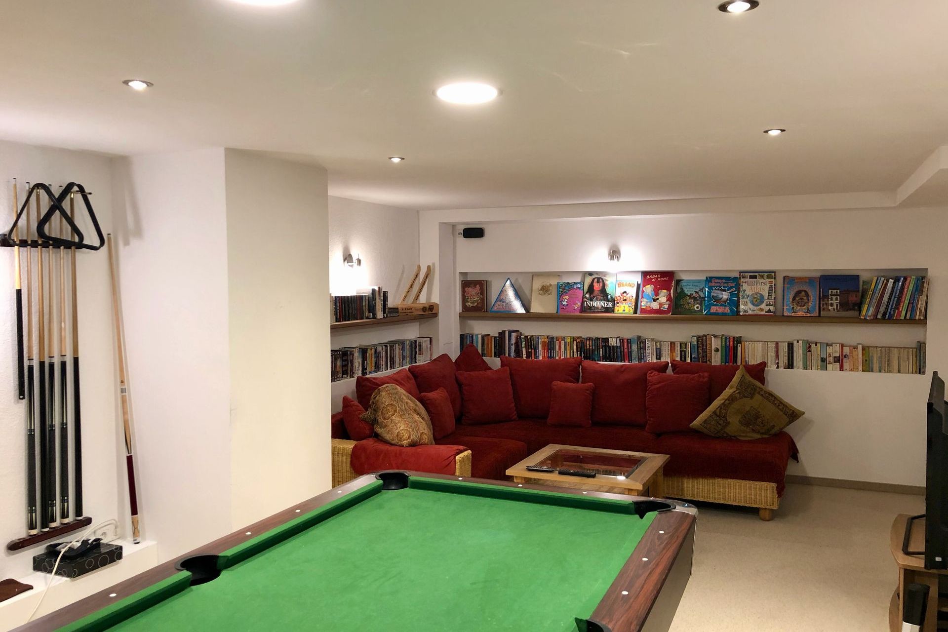 Large family games room with sofas, TV, pool table and “The Smallest Pub in Tirol”